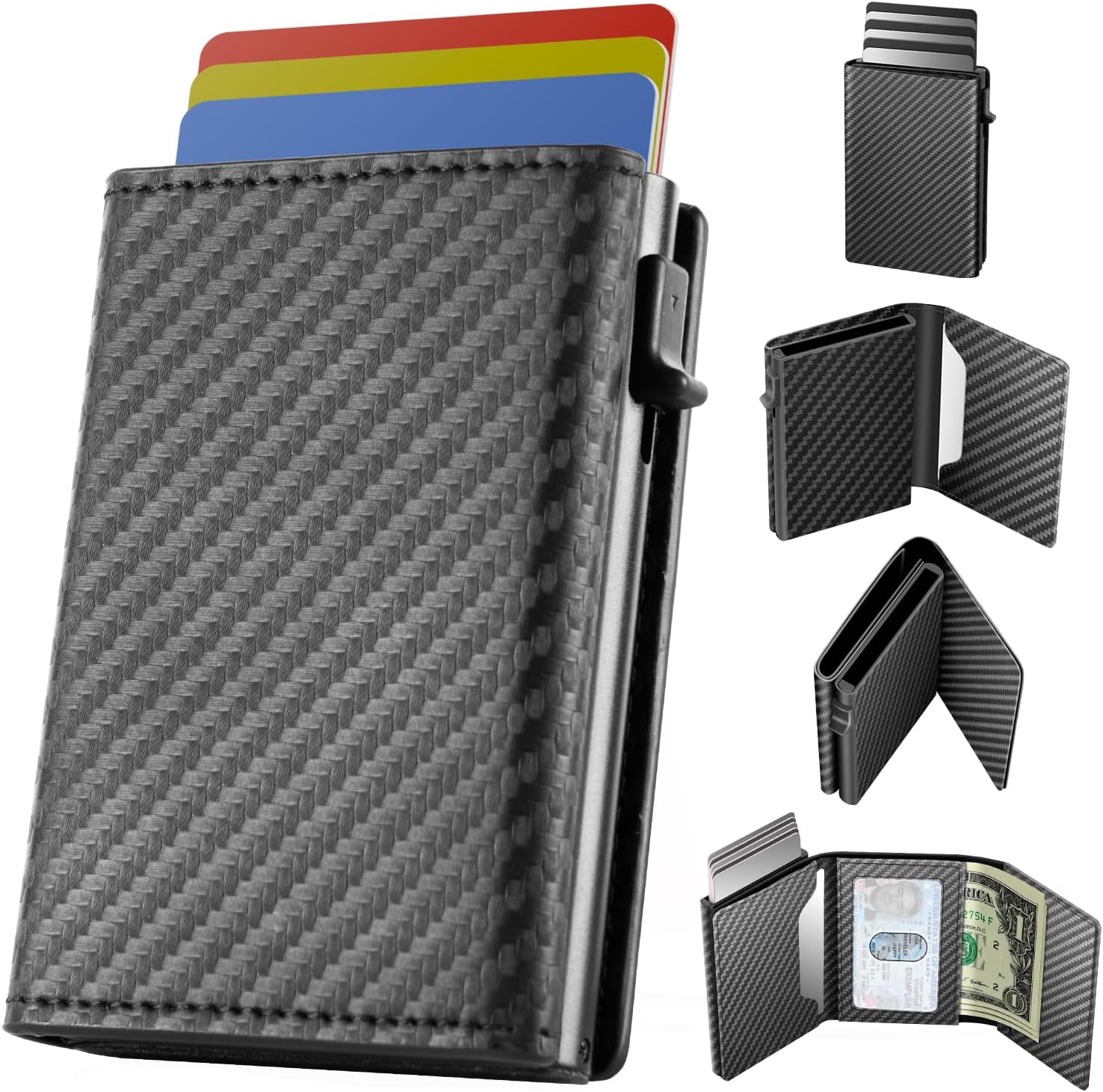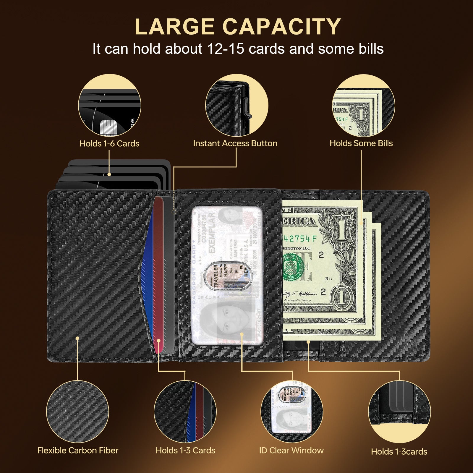 WELLNEC Mens Wallet Card Holder - for 12-15 Cards, Slim Pop Up Wallet for Men, ID Window, Smart Wallet with RFID Blocking, Front Pocket, Cash Slot, Easily Removable Money & Cards, Carbon Fiber