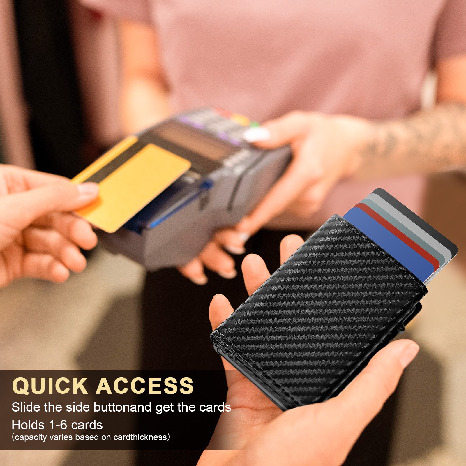 - 💳【One Touch Access】This pop up wallet Wallet features a pop-up card case that can hold up to 6 cards and the desired card can be quickly accessed with the press of a button. (capacity varies based on card thickness).