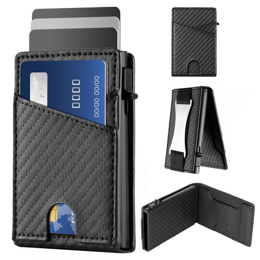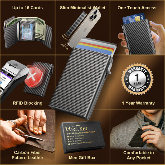 WELLNEC Mens Pop Up Wallet for Credit Card Holder - Wallet for Men with ID Window and 12-15 Cards Capacity, Smart Wallet RFID Blocking, Front Pocket, Cash Slot,Carbon Fiber Leather